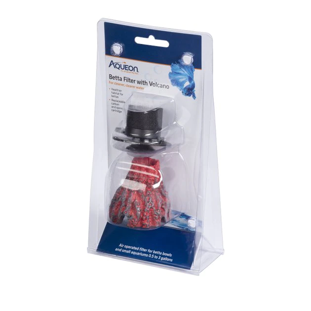 The Aqueon Betta Volcano Betta Fish Aquarium Filter is an open-air operated filter that is designed to filter water in small betta habitats, including bowls and aquariums that hold up to 3 gallons of water. The replaceable carbon and sponge cartridge help keep water clearer and cleaner and every purchase comes with a fun volcano decoration to help conceal the filter. You will also get multiple accessories for operation, including airline tubing, airline tubing suction cups and an air adjustment valve and check valve. However please note that an air pump (sold separately) is required in order to operate the betta filters—the Aqueon QuietFlow Air Pump 10 is recommended.