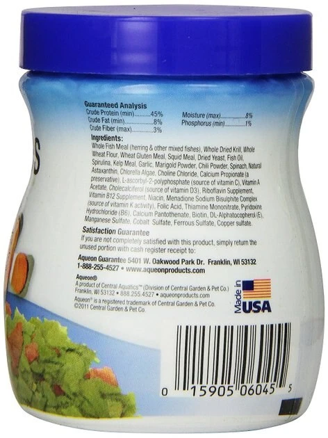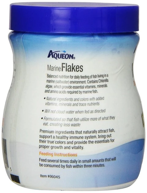 Aqueon Marine Flaked Fish Food is filled with all of the premium ingredients saltwater fish prefer. This daily diet is made with only natural ingredients with no artificial colors that are sometimes added to low-quality foods to enhance flake color. Quality whole fish meal is used to provide the complete range of nutrients needed to keep fish healthy and full of energy. These flakes are specially formulated to allow marine fish to utilize more of what they eat, which creates less waste in the aquarium.