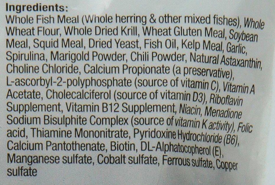 Whole Fish Meal (Whole Salmon, Herring & Other Mixed Fishes), Whole Dried Krill, Whole Wheat Flour, Wheat Gluten Meal, Squid Meal, Dried Yeast, Fish Oil, Spirulina, Kelp Meal, Garlic, Marigold Powder, Chili Powder, Spinach, Natural Astaxanthin, Chlorella Algae, Choline Chloride, Calcium Propionate (a Preservative), L-Ascorbyl-2-Polyphosphate (Source of Vitamin C), Vitamin A Acetate, Cholecalciferol (Source of Vitamin D3), Riboflavin Supplement, Vitamin B12 Supplement, Niacin, Menadione Sodium Bisulphite Complex (Source of Vitamin K Activity), Folic Acid, Thiamine, Pyridoxine Hydrochloride (B6), Calcium Pantothenate, Biotin, Dl-Alphatocopherol (E), Manganese Sulfate, Cobalt Sulfate, Ferrous Sulfate, Copper Sulfate.