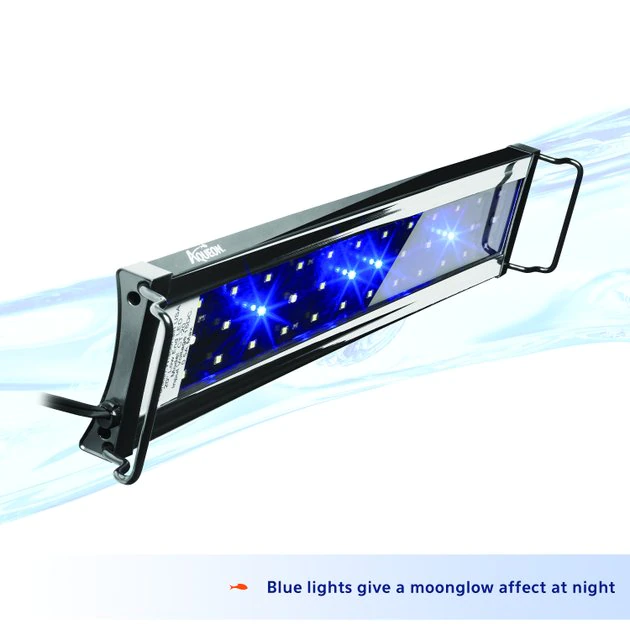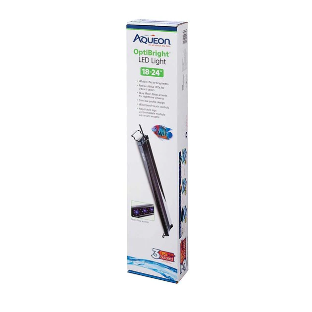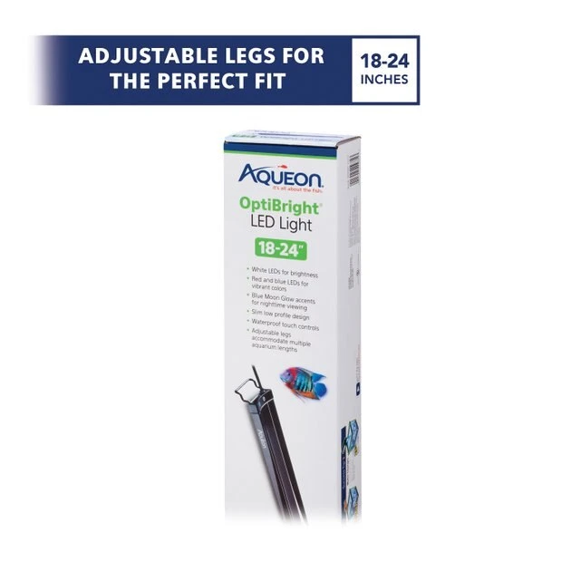 Brighten up your tank with the Aqueon Optibright LED Aquarium Light Fixture. It features a slim, low-profile design with two waterproof touch controls. They can be used independently or simultaneously for day and nighttime viewing to have the bright white/red LEDs on during the day and the subtle blue moon glow accent LEDs at night. This fixture also has adjustable legs that fit a variety of aquarium sizes. Aqueon Optibright LED Aquarium Light Fixture is ideal for freshwater or saltwater fish and low-medium light level plants.