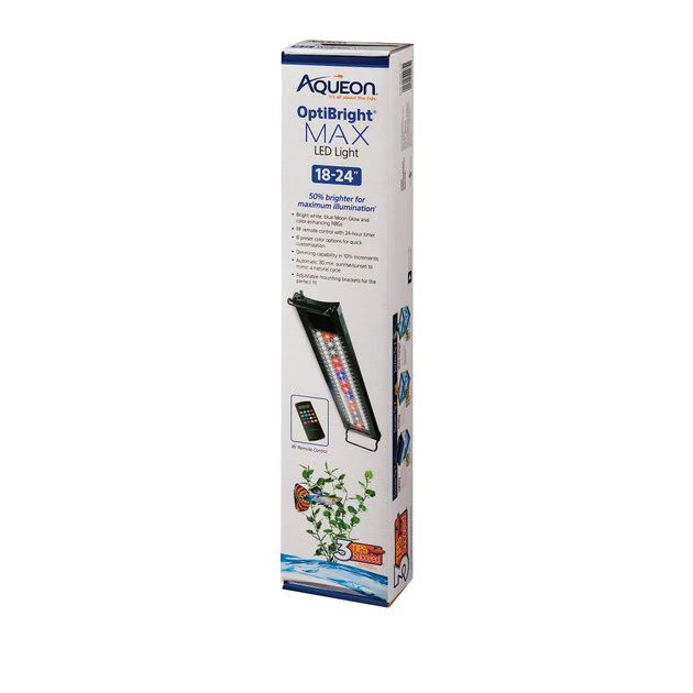 Customize the colors of your tank with Aqueon Optibright Max LED Aquarium Light Fixture. It features an easy-to-use remote control with bright LED lights that come in eight preset colors. The 24-hour timer allows for color adjustability in 10% increments and a 3-speed color scroll mode. This low-profile fixture also has adjustable legs to fit multiple aquarium lengths. Aqueon Optibright Max LED Aquarium Light Fixture is ideal for freshwater or saltwater fish and low-medium light level plants.