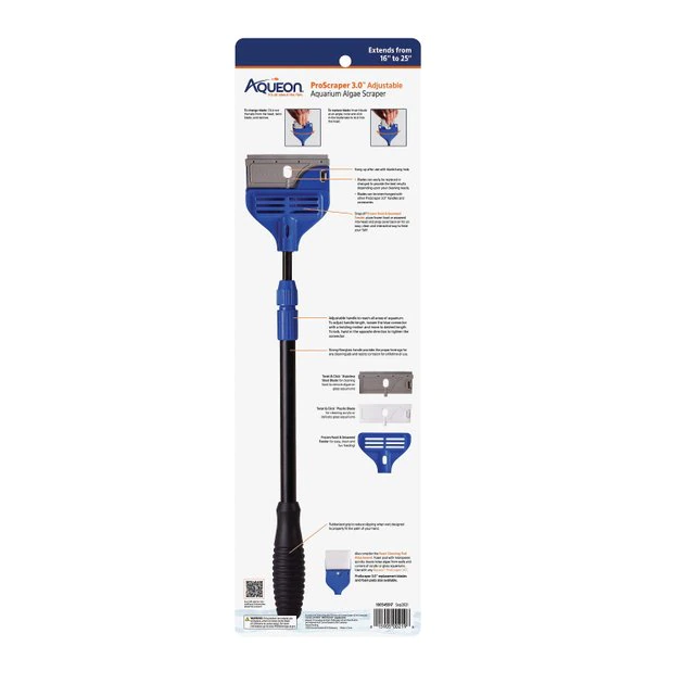 Say adios to algae with the Aqueon ProScraper 3.0 Adjustable Aquarium Algae Scraper! This scraper helps remove pesky algae from any nooks and crannies in your tank. Choose between two included blades—a stainless steel blade that’s resistant to rust and severely removes algae, and a plastic blade to be used when you want to be more careful around the glass. All it takes to adjust the length is loosening the blue connector by twisting and clicking. You won’t lose your grip thanks to the rubber material around the scraper handle. As a bonus, this product even includes a frozen food and seawater feeder for an engaging and innovative way to feed your underwater pals.