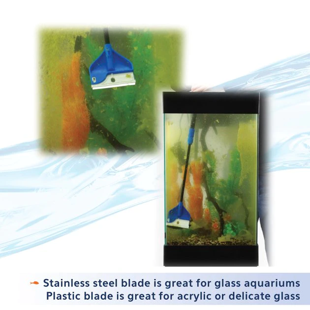 - Includes a rust-resistant, stainless steel blade for intense algae removal, as well as a plastic blade that reduces the risk of scratches and works well for acrylic and delicate glass.