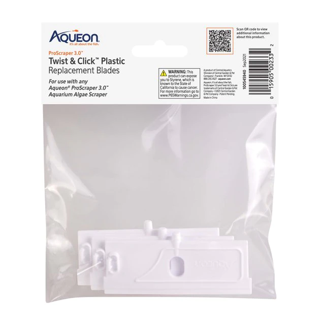 Keeping up with your aquarium can be hard work, but Aqueon ProScraper helps make it easier! When your plastic blades become worn down and dull, Aqueon ProScraper 3.0 Twist & Click Plastic Replacement Blades ensure that you can simply switch out the blade rather than replacing your whole scraper. These blades were specifically designed to fit in your Aqueon ProScraper 3.0 Aquarium Algae Scraper (sold separately). Simply click out the tabs from the top, twist the blade, and remove. The plastic blades are fin-tastic for cleaning acrylic or delicate glass habitats, as they help reduce the risk of scratching.
