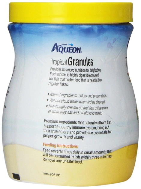 Aqueon Tropical Granules Fish Food gives your tropical fish a heartier food than the typical flakes. These slow-sinking granules are easy to digest and provide a nutritious daily diet to keep your fish energetic and full of energy. The colors of the flakes are derived from natural sources such as spinach and red chili powder, not artificial colors that are sometimes added to lower-quality foods. Tropical fish will find all the foods they love to eat, including krill and squid. They’re nutritionally complete, so your fish will be able to utilize more vital nutrients and create less waste in the aquarium.