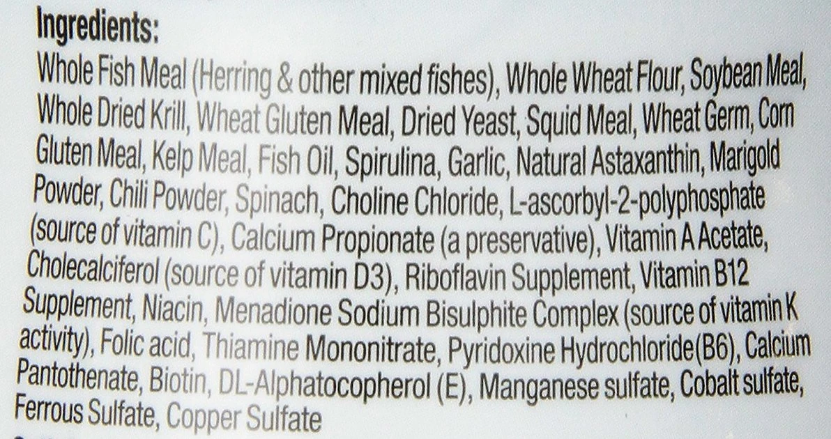 Whole Fish Meal (Whole Salmon, Herring & Other Mixed Fishes), Whole Wheat Flour, Soybean Meal, Whole Dried Krill, Wheat Gluten Meal, Dried Yeast, Squid Meal, Kelp Meal, Wheat Germ, Fish Oil, Corn Gluten Meal, Spirulina, Garlic, Natural Astaxanthin, Marigold Powder, Chili Powder, Spinach, Choline Chloride, Calcium Propionate (a Preservative), L-Ascorbyl-2-Polyphosphate (Source of Vitamin C), Vitamin A Acetate, Cholecalciferol (Source of Vitamin D3), Riboflavin Supplement, Vitamin B12 Supplement, Niacin, Menadione Sodium Bisulphite Complex (Source of Vitamin K Activity), Folic Acid, Thiamine, Pyridoxine Hydrochloride (B6), Calcium Pantothenate, Biotin, Dl-Alphatocopherol (E), Manganese Sulfate, Cobalt Sulfate, Ferrous Sulfate, Copper Sulfate.