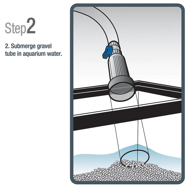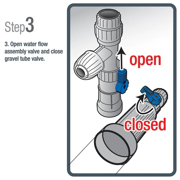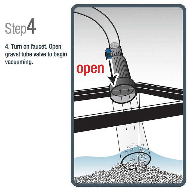 Turn on faucet. Open gravel tube valve to begin vacuuming.