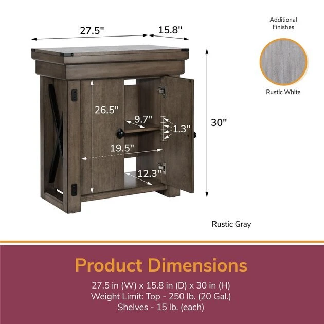 Flipper by Ollie & Hutch Neptune Fish Aquarium Stand, Rustic Gray, 20-gal—Proudly display your fishy friends’ aquarium with Flipper by Ollie and Hutch Neptune Fish Aquarium Stand. Made of wood veneer laminated particleboard and sturdy but stylish black metal hardware, this stand has a rustic finish that complements home decor. The durable materials let it hold most twenty-gallon setups or 250 pounds. The stand has two fixed shelves that provide you with ample space to store fish food, nets, water treatments, cleaning supplies, and more in an organized, out-of-sight way. Its rectangular shape lets the aquarium fit against a wall with a three-way view of your fishy friends. This stand is a fintastic way to display saltwater or freshwater aquariums up to thirty-seven gallons.