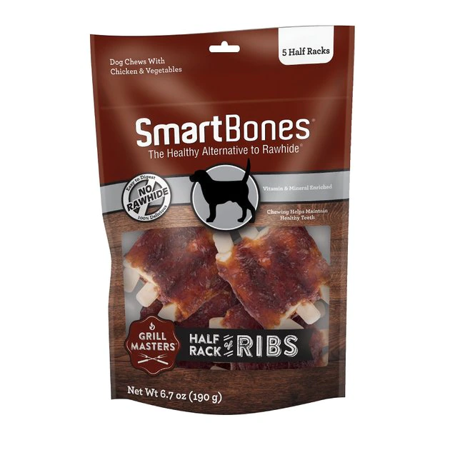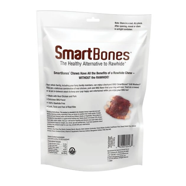 Make treat time feel like a backyard BBQ with SmartBones Grill Masters Ribs Half Racks Dog Treats. These 100% rawhide-free chews are vitamin and mineral-enriched, and they look, taste and feel like real ribs! Made from a delicious combination of real chicken, pork and vegetables, they have an irresistible BBQ flavor and are wildly engaging for your pup. The fun shape and chewy texture encourage natural canine chewing behavior to help maintain healthy teeth. Give one or two a day as a reward or an in-between snack—they’re also a great treat for grill day, to help your pup get in on the action!
