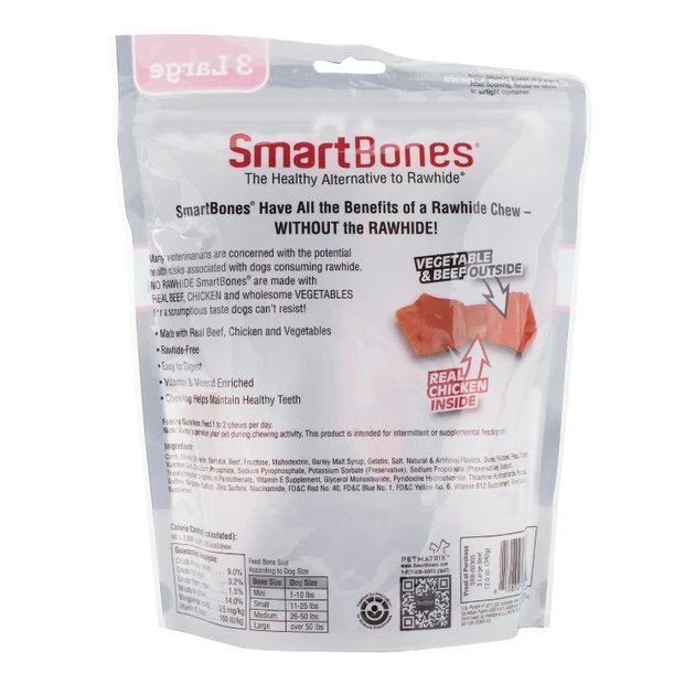 SmartBones Large Beef Chew Bones Dog Treats are truly the smarter choice for a top-quality alternative to rawhide. Made for larger dogs, these mighty treats have all the great taste, satisfaction and lasting chew time of rawhide without the safety, digestibility and health concerns. Now pet parents have another option—a chew that’s easy to digest, low in fat and made with real beef, chicken and vegetables along with essential vitamins and minerals. SmartBones Large Beef Chew Bones Dog Treats are the next generation of chews that have all the benefits of rawhide without the risks.