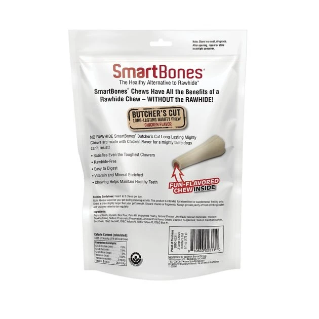 SmartBones Large Butcher’s Cut Chicken Flavor Chews Dog Treats are large, bone-shaped chews that make a delicious and safe alternative to real bones and rawhide. They’ve got all the great taste, satisfaction and lasting chew time but without the splintering, sharp edges, high fat content and choking hazards. Instead, these flavorful, grain-free Butcher’s Cut treats are easy to digest, low in fat and full of vitamins. They’re made with wholesome real chicken and veggies with a hidden surprise—a pork-flavored chewy center. SmartBones Large Butcher’s Cut Chicken Flavor Chews Dog Treats are innovative chews that have all the benefits of rawhide and real bones without the risks.