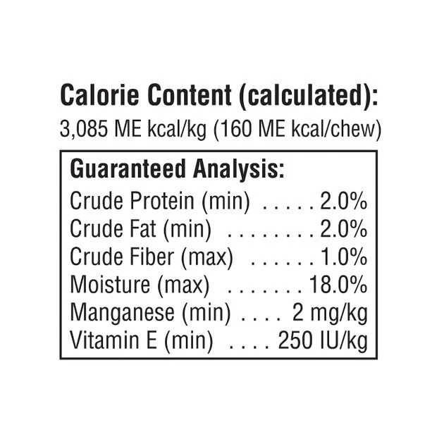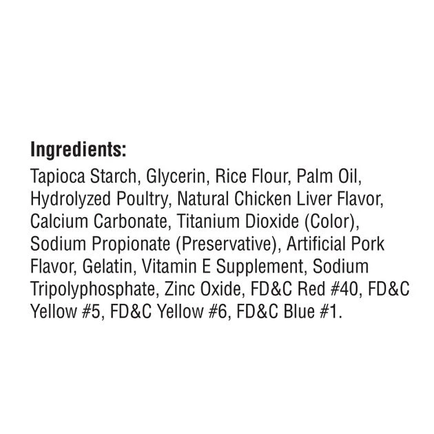 Tapioca, Glycerin, Rice, Vegetable Oil, Chicken, Natural Chicken Liver Flavor, Calcium Carbonate, Titanium Dioxide, Sodium Propionate (Preservative), Gelatin, Bacon Flavor, Vitamin E Supplement, Pineapple, Sodium Tripolyphosphate, Zinc Oxide, Fd & C Red No. 40, Fd & C Yellow No. 6, Fd & C Blue No. 1.