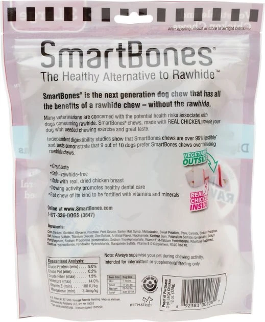 Many veterinarians are concerned with the potential health risks associated with dogs consuming rawhide. Rawhide-free SmartBones chews made with real chicken, vegetables and other healthy ingredients dogs love provide your canine companion with needed chewing exercise and great taste. Veterinarian approved, these chew treats are the healthier alternative to regular rawhide treats which may cause intestinal blockages. SmartBones are 99.2% digestible, which is higher than the digestibility of premium dog foods (85% digestibility). Smart bones for smart dogs!