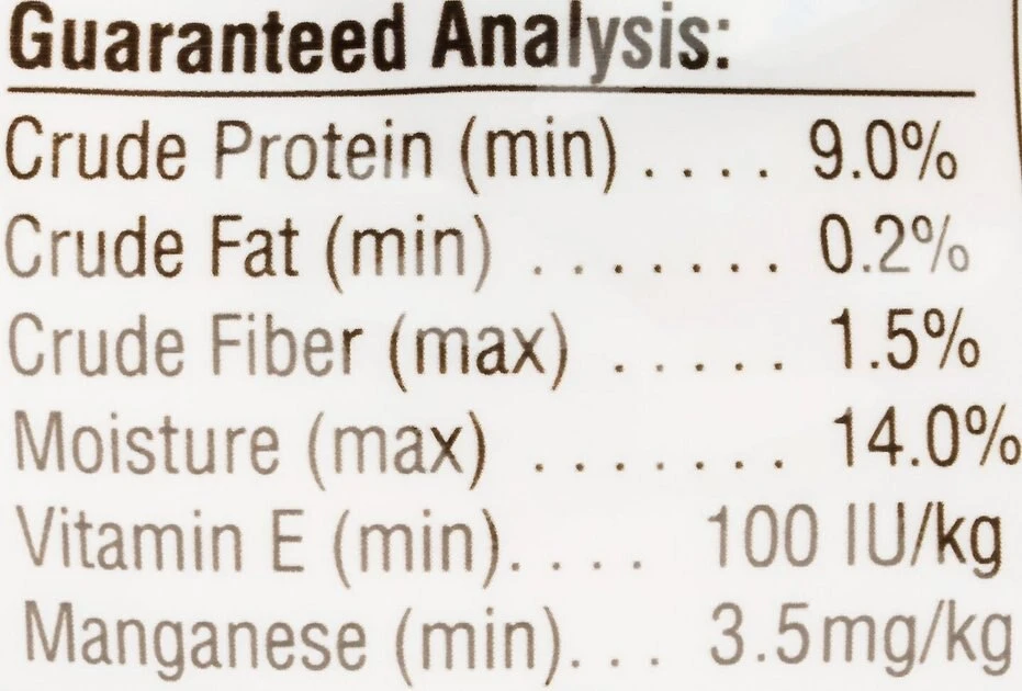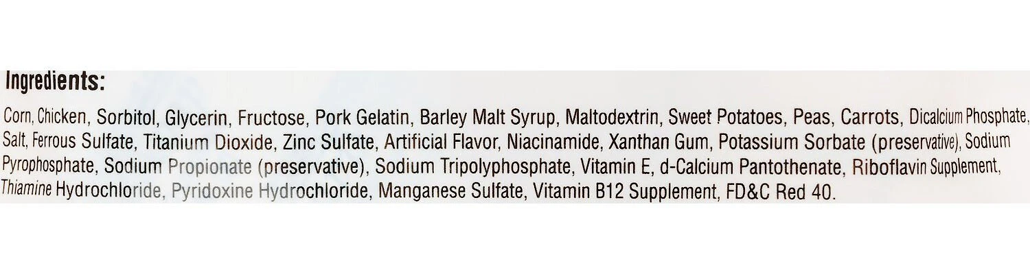 Corn, Chicken, Sorbitol, Glycerin, Fructose, Pork Gelatin, Barley Malt Syrup, Maltodextrin, Sweet Potatoes, Peas, Carrots, Dicalcium Phosphate, Salt, Ferrous Sulfate, Titanium Dioxide, Zinc Sulfate, Artificial Flavor, Niacinamide, Xanthan Gum, Potassium Sorbate (Preservative), Sodium Pyrophosphate, Sodium Propionate (Preservative), Sodium Tripolyphosphate, Vitamin E, D-Calcium Pantothenate, Riboflavin Supplement, Thiamine Hydrochloride, Pyridoxine Hydrochloride, Manganese Sulfate, Vitamin B12 Supplement, FD&C Red 40. Vitamins & Minerals: Ferrous Sulfate, Zinc Sulfate, Niacin, (Niacinamide, Vitamin E, D-Calcium Pantothenate, Riboflavin Supplement, Thiamine Hydrochloride, Pyridoxine Hydrochloride, Manganese Sulfate, Vitamin B12 Supplement.