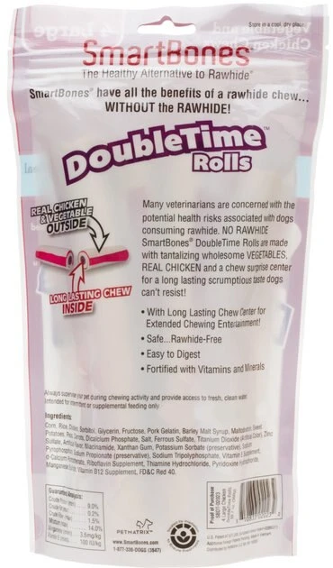 SmartBones is the next generation dog chew that has all the benefits of a rawhide chew…without the rawhide! They are tasty chews that will help keep your dog’s teeth clean and healthy. DoubleTime Rolls have a long-lasting chew center to keep your dog happy and busy.