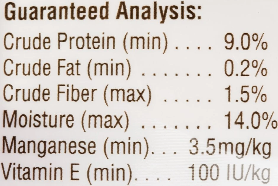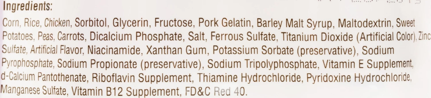 Corn, Rice, Chicken, Sorbitol, Glycerin, Fructose, Pork Gelatin, Barley Malt Syrup, Maltodextrin, Sweet Potatoes, Peas, Carrots, Dicalcium Phosphate, Salt, Ferrous Sulfate, Titanium Dioxide (Artificial Color), Zinc Sulfate, Artificial Flavor, Niacinamide, Xanthan Gum, Potassium Sorbate (Preservative), Sodium Pyrophosphate, Sodium Propionate (Preservative), Sodium Tripolyphosphate, Vitamin E Supplement, D-Calcium Pantothenate, Riboflavin Supplement, Thiamine Hydrochloride, Pyridoxine Hydrochloride, Manganese Sulfate, Vitamin B12 Supplement, Fd & C Red 40.