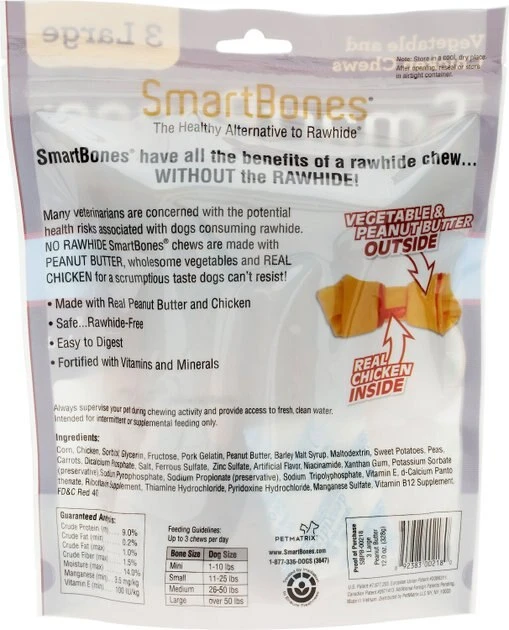 Many veterinarians are concerned with the potential health risks associated with dogs consuming rawhide. Rawhide-free SmartBones chews made with real chicken, vegetables and other healthy ingredients dogs love provide your canine companion with needed chewing exercise and great taste. Veterinarian approved, these chew treats are the healthier alternative to regular rawhide treats which may cause intestinal blockages. SmartBones are 99.2% digestible, which is higher than the digestibility of premium dog foods (85%Â digestibility). Smart bones for smart dogs!