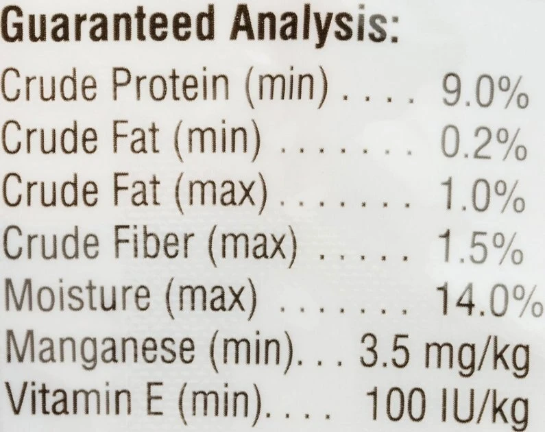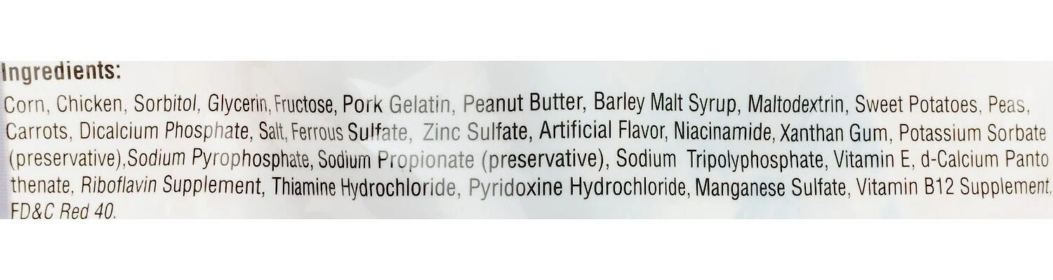Corn, Chicken, Sorbitol, Glycerin, Fructose, Pork Gelatin, Peanut Butter, Barley Malt Syrup, Maltodextrin, Sweet Potatoes, Peas, Carrots, Dicalcium Phosphate, Salt, Ferrous Sulfate, Titanium Dioxide, Zinc Sulfate, Artificial Flavor, Niacinamide, Xanthan Gum, Potassium Sorbate (Preservative), Sodium Pyrophosphate, Sodium Propionate (Preservative), Sodium Tripolyphosphate, Vitamin E, D-Calcium Pantothenate, Riboflavin Supplement, Thiamine Hydrochloride, Pyridoxine Hydrochloride, Manganese Sulfate, Vitamin B12 Supplement, FD&C Red 40. Vitamins & Minerals: Ferrous Sulfate, Zinc Sulfate, Niacin, (Niacinamide, Vitamin E, D-Calcium Pantothenate, Riboflavin Supplement, Thiamine Hydrochloride, Pyridoxine Hydrochloride, Manganese Sulfate, Vitamin B12 Supplement.