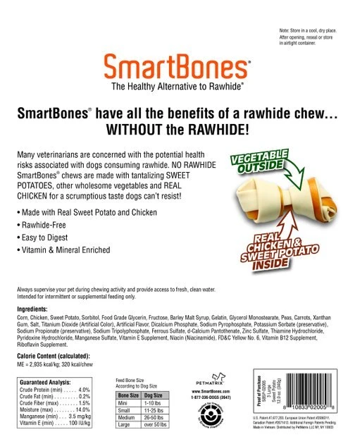 Corn, Chicken, Sweet Potato, Sorbitol, Glycerin, Fructose, Barley Malt Syrup, Gelatin, Maltodextrin, 2,3 Dihydroxypropyl Octadecanoate, Peas, Carrots, Xanthan Gum, Salt, Titanium Dioxide (Artificial Color), Artificial Flavor, Dicalcium Phosphate, Sodium Pyrophosphate, Potassium Sorbate (Preservative), Sodium Propionate (Preservative), Sodium Tripolyphosphate, Ferrous Sulfate, D-Calcium Pantothenate, Zinc Sulfate, Thiamine Hydrochloride, Pyridoxine Hydrochloride, Manganese Sulfate, Vitamin E Supplement, Niacin (Niacinamide), FD&C Yellow No. 6, Vitamin B12 Supplement, Riboflavin Supplement.