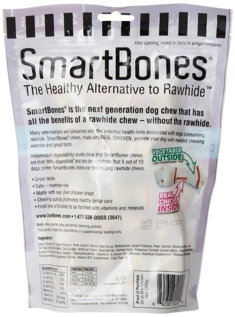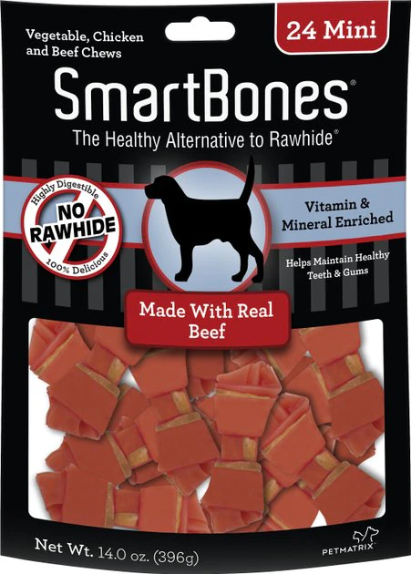 SmartBones Mini Beef Chew Bones Dog Treats are truly the smarter choice for a top-quality alternative to rawhide. Made for tiny pups, these miniature treats have all the great taste, satisfaction and lasting chew time of rawhide without the safety, digestibility and health concerns. Now pet parents have another option—a chew that’s easy to digest, low in fat and made with real beef, chicken and vegetables along with essential vitamins and minerals. SmartBones Mini Beef Chew Bones Dog Treats are the next generation of chews that have all the benefits of rawhide without the risks.