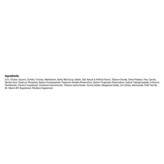 Corn, Chicken, Glycerin, Sorbitol, Fructose, Maltodextrin, Barley Malt Syrup, Gelatin, Salt, Natural & Artificial Flavors, Titanium Dioxide, Sweet Potatoes, Peas, Carrots, Xanthan Gum, Dicalcium Phosphate, Sodium Pyrophosphate, Potassium Sorbate (Preservative), Sodium Propionate (Preservative), Sodium Tripolyphosphate, D-Calcium Pantothenate, Vitamin E Supplement, Pyridoxine Hydrochloride, Thiamine Hydrochloride, Ferrous Sulfate, Manganese Sulfate, Zinc Sulfate, Niacinamide, FD&C Red No. 40, Vitamin B12 Supplement, Riboflavin Supplement