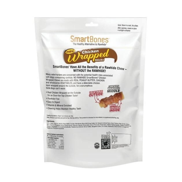Dogs go head-over-tail for SmartBones Mini Chicken Wrapped Sticks Peanut Butter Dog Treats! These wag-worthy peanut-buttery rewards are crafted with real chicken inside, real vegetables outside and wrapped with a real layer of chicken—just when your dog thinks his treat is too good to be true, it gets even better the more he chews. These sticks also have the texture of a rawhide chew without the rawhide, which means they not only help scrape away plaque and tartar, but they are also easy to digest! And to top it all off, SmartBones Mini Chicken Wrapped Sticks Peanut Butter Dog Treats are enriched with vitamins and minerals to support overall health.