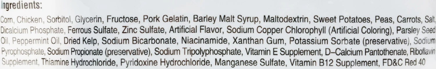 Corn, Chicken, Sorbitol, Glycerin, Fructose, Pork Gelatin, Barley Malt Syrup, Maltodextrin, Sweet Potatoes, Peas, Carrots, Salt, Dicalcium Phosphate, Ferrous Sulfate, Titanium Dioxide, Zinc Sulfate, Artificial Flavor, Chlorophyllin, Parsley Seed Oil, Dried Kelp, Niacinamide, Xanthan Gum, Potassium Sorbate (Preservative), Sodium Pyrophosphate, Sodium Propionate (Preservative), Sodium Tripolyphosphate, Vitamin E, D-Calcium Pantothenate, Riboflavin Supplement, Thiamine Hydrochloride, Pyridoxine Hydrochloride, Manganese Sulfate, Vitamin B12 Supplement, FD&C Red 40.
