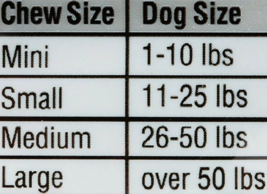 - Mini Chew Packs are perfect for small dog breeds (5-10 pounds) – each bone measures approximately 2 inches long.