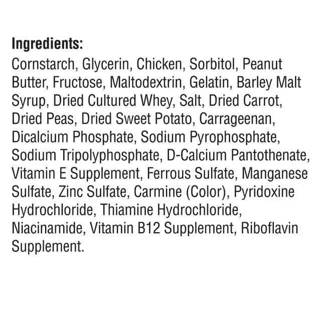Cornstarch, Glycerin, Chicken, Sorbitol, Peanut Butter, Fructose, Maltodextrin, Gelatin, Barley Malt Syrup, Dried Cultured Whey, Salt, Dried Carrot, Dried Sweet Potato, Dried Peas, Carrageenan, Dicalcium Phosphate, Sodium Pyrophosphate, Sodium Tripolyphosphate, D-Calcium Panthothenate, Vitamin E Supplement, Ferrous Sulfate, Manganese Sulfate, Zinc Sulfate, Carmine (Color), Pyridoxine Hydrochloride, Thiamine Hydrochloride, Niacinamide, Vitamin B12 Supplement, Riboflavin Supplement