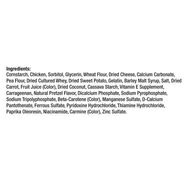 Cornstarch, Chicken, Sorbitol, Glycerin, Wheat Flour, Dried Cheese, Calcium Carbonate, Pea Flour, Dried Cultured Whey, Dried Sweet Potato, Gelatin, Barley Malt Syrup, Salt, Dried Carrot, Fruit Juice (Color), Dried Coconut, Cassava Starch, Vitamin E Supplement, Carrageenan, Natural Pretzel Flavor, Dicalcium Phosphate, Sodium Pyrophosphate, Sodium Tripolyphosphate, Beta-Carotene (Color), Manganese Sulfate, D-Calcium Pantothenate, Ferrous Sulfate, Pyridoxine Hydrochloride, Thiamine Hydrochloride, Paprika Oleoresin, Niacinamide, Carmine (Color), Zinc Sulfate