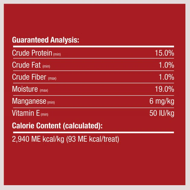 Sweet Potato Flour, Tapioca Starch, Chicken, Beef, Glycerin, Pork, Calcium Carbonate, Cauliflower Flour, Caramel (Color), Carmine (Color), Paprika Oleoresin (Color), Vitamin E Supplement, Manganese Sulfate