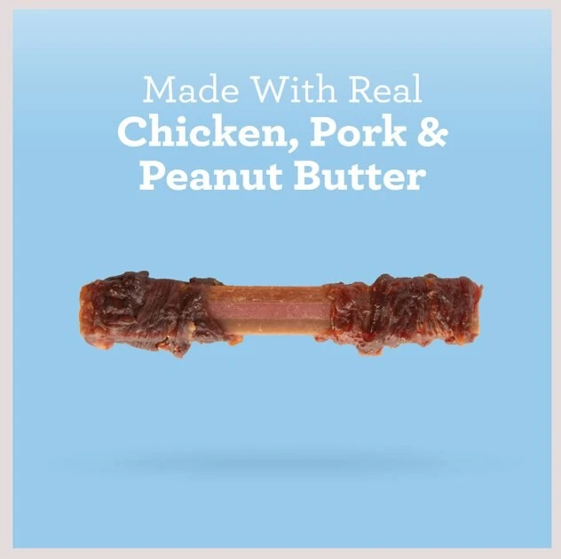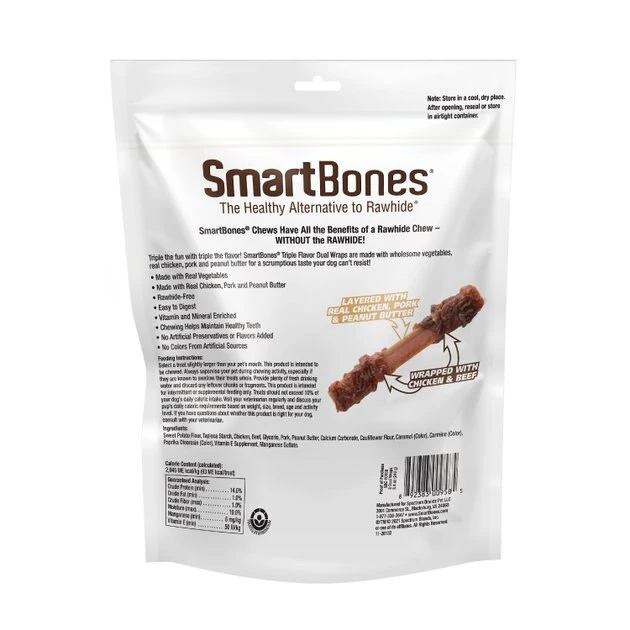 Treat your pup to a chew worth barking about with SmartBones Triple Flavor Dual Wraps Real Chicken, Pork & Peanut Butter Dog Treats. With triple the flavor and triple the fun, these tasty chews are full of delicious goodness. Made with real chicken and wholesome vegetables, plus delicious pork and peanut butter, they have an irresistible taste your dog will love. SmartBones chews offer all the benefits of a rawhide chew—but without the rawhide, so you can feel even better about feeding them. Regular chewing helps maintain healthy teeth and gums, and these Dual Wrap chews are the perfect way to encourage healthy chewing. Each chew is enriched with vitamins and minerals and made without any artificial colors, preservatives or flavors. Tails will really be wagging when you bring out these no-rawhide, triple-flavor snacks!