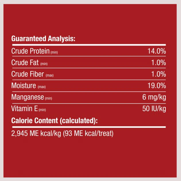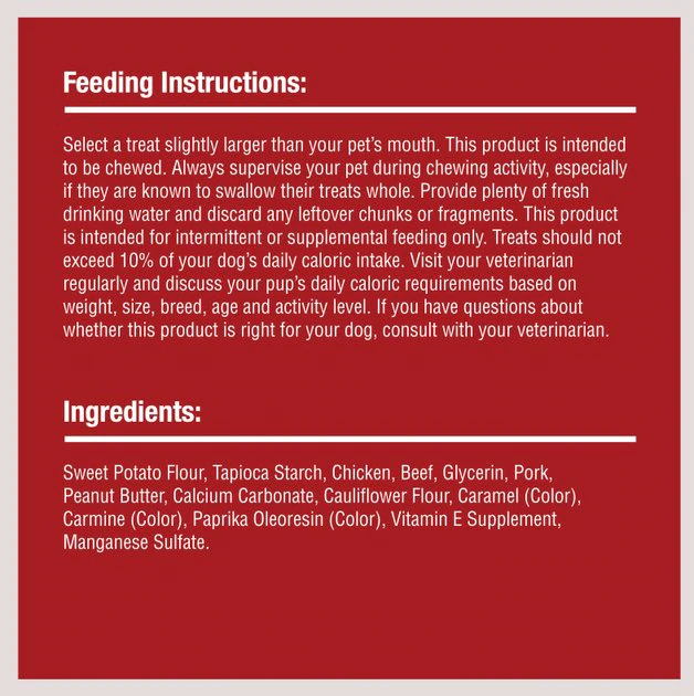 Sweet Potato Flour, Tapioca Starch, Chicken, Beef, Glycerin, Pork, Peanut Butter, Calcium Carbonate, Cauliflower Flour, Caramel (Color), Carmine (Color), Paprika Oleoresin (Color), Vitamin E Supplement, Manganese Sulfate
