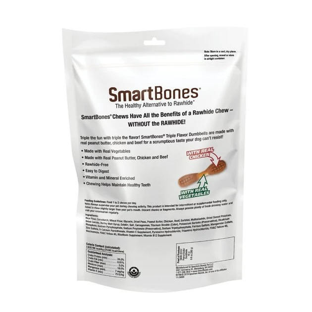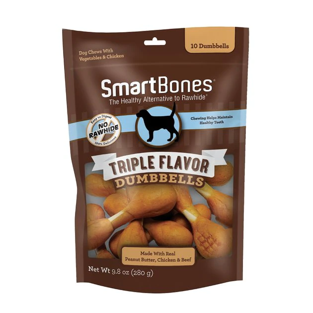 - SmartBones Triple Flavor Dumbbells have all the benefits of a rawhide chew–without the rawhide.