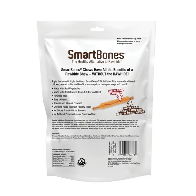 Give your dog triple the flavor and triple the fun with SmartBones Triple Flavor Ribs Chicken, Beef & Peanut Butter Dog Treats. Made with a trifecta of real chicken, tasty peanut butter and hearty beef—plus wholesome veggies—these easy-to-digest, rawhide-free chews have a scrumptious taste dogs can’t resist. They are enriched with vitamins and minerals and contain no artificial colors, preservatives or flavors, for a treat you can always feel good about giving your pup. If you’re looking for a healthy alternative to rawhide, look no further, for these are everything your dog could want in a chew!