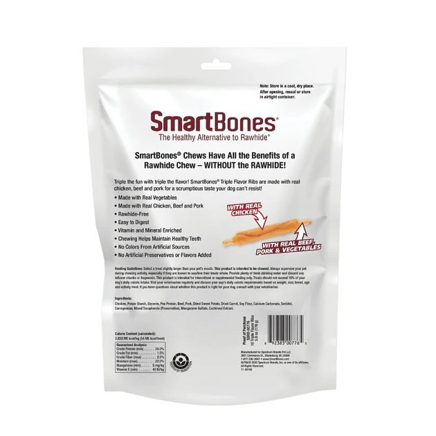Give your dog triple the flavor and triple the fun with SmartBones Triple Flavor Ribs Chicken, Beef & Pork Dog Treats. Made with real chicken, savory beef and tasty pork—plus wholesome veggies—these chews have a scrumptious taste dogs can’t resist. The rawhide-free recipe is easy to digest and enriched with vitamins and minerals, for a treat you can feel good about giving your pup. With no colors from artificial sources and no artificial preservatives or flavors added, these wag-worthy rewards are everything your dog wants in a chew!