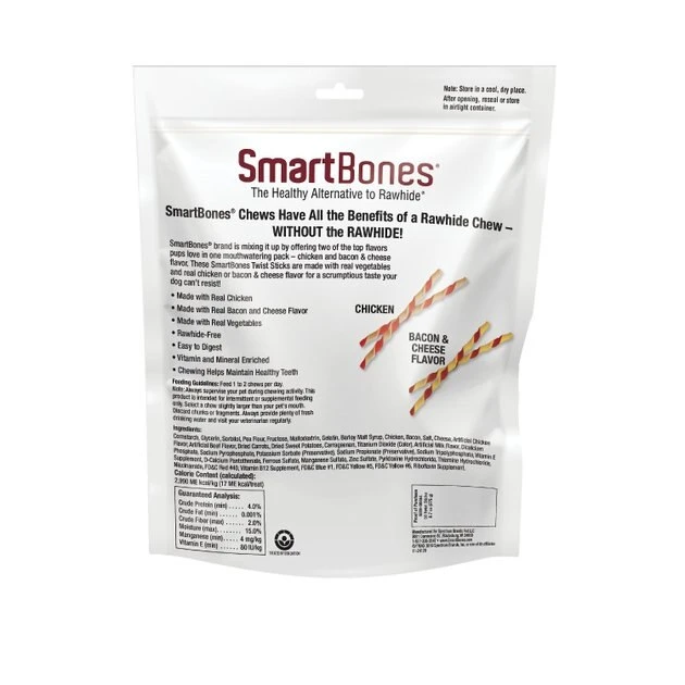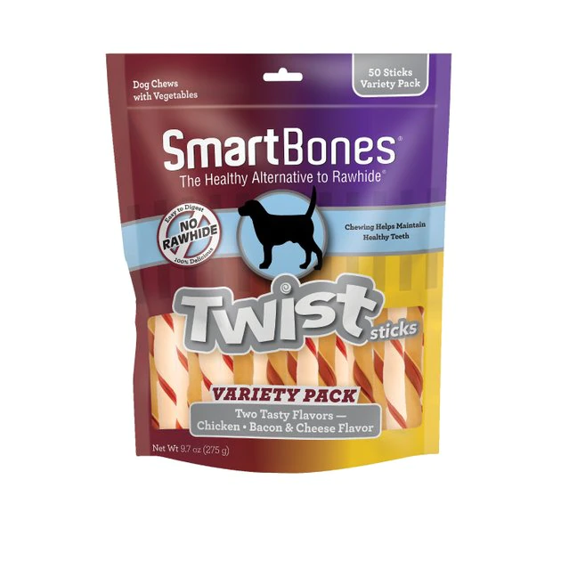 Feed your furry friend a healthy rawhide-free reward you can feel good about with SmartBones Twist Sticks Variety Pack Real Chicken, Bacon & Cheese Flavor Dog Treats! This variety pack includes two of SmartBones’ most pup-ular flavors—Chicken and Bacon & Cheese Flavor. Each recipe is made with either real chicken or bacon and cheese flavor for the taste dogs love and they are both enriched with vitamins and minerals. While your buddy chews to his heart’s content, these easily digestible dog treats will help maintain healthy teeth!
