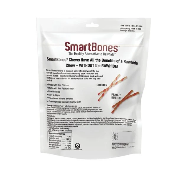 Feed your furry friend a healthy rawhide-free reward you can feel good about with SmartBones Twist Sticks Variety Pack Real Chicken & Peanut Butter Flavor Dog Treats! This variety pack includes two of SmartBones’ most pup-ular flavors—Chicken and Peanut Butter. Each flavor is made with either real chicken or peanut butter for the flavor dogs love and both recipes are enriched with vitamins and minerals. While your buddy chews to his heart’s content, these easily digestible dog treats will help maintain healthy teeth!