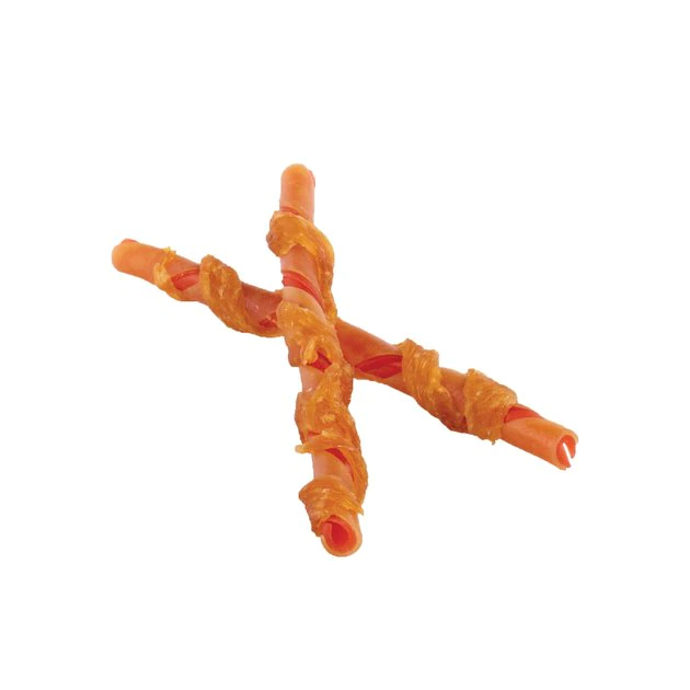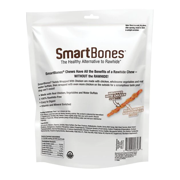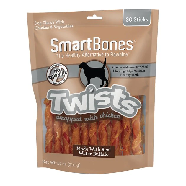 Your pup will be wrapped around your finger every time you bring out SmartBones Twists Wrapped Chicken Dog Treats. These tasty twists are made with real chicken, wholesome vegetables, and real water buffalo, then wrapped with even more chicken! A healthy alternative to rawhide, these rawhide-free chews are easy to digest and fantastically delicious. Chewing helps dogs maintain healthy teeth, and your dog will just love sinking his teeth into these chicken-wrapped twists. Giving your dog a treat you can both be happy about just got a whole lot easier!
