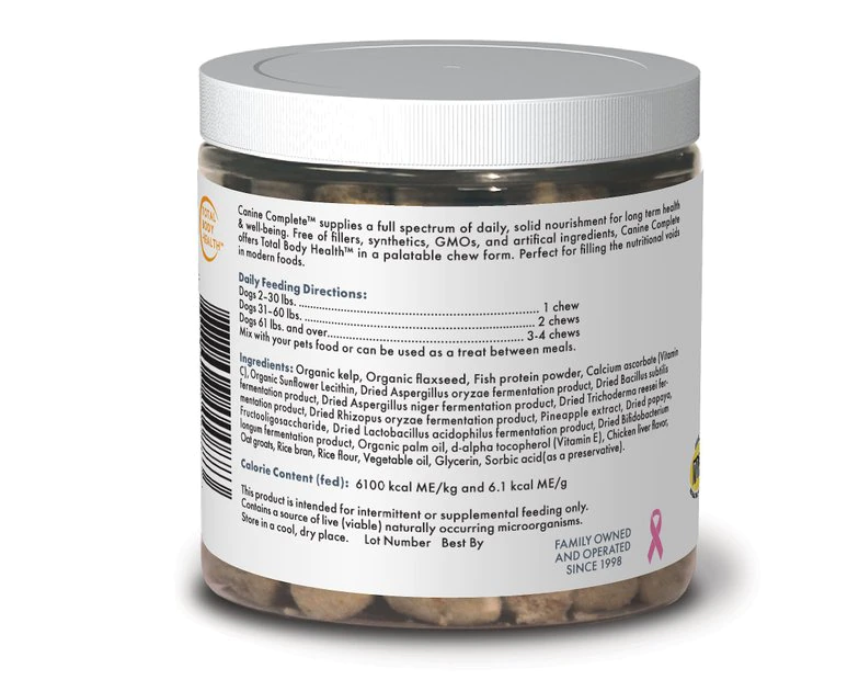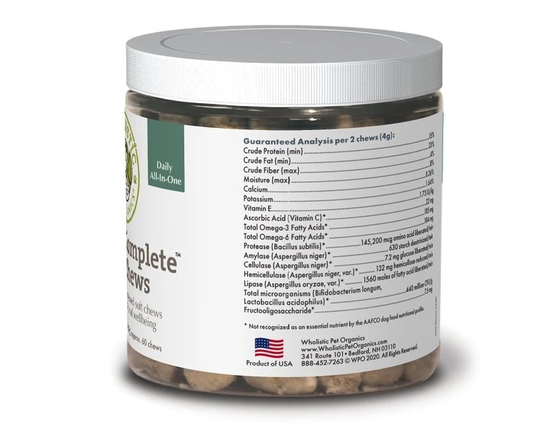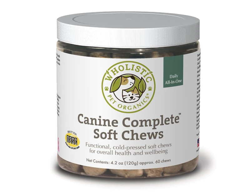 Give your pooch a boost of nutrition with the Wholistic Pet Organics Canine Complete Soft Chews All-in-One Supplement. Formulated to help promote total body health in dogs of all ages, these cold-pressed soft chews pack essential nutrients to supplement your pal’s diet in every delicious bite. They’re made in the USA with whole-food and organic ingredients like kelp and flaxseeds, and loaded with vitamins and minerals for nose-to-tail well-being, digestive enzymes to help support normal digestion, omegas and free-radical-fighting antioxidants. Plus, they’re made with tasty fish protein powder so they’re tasty and easy to give, as a treat or snack.