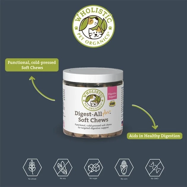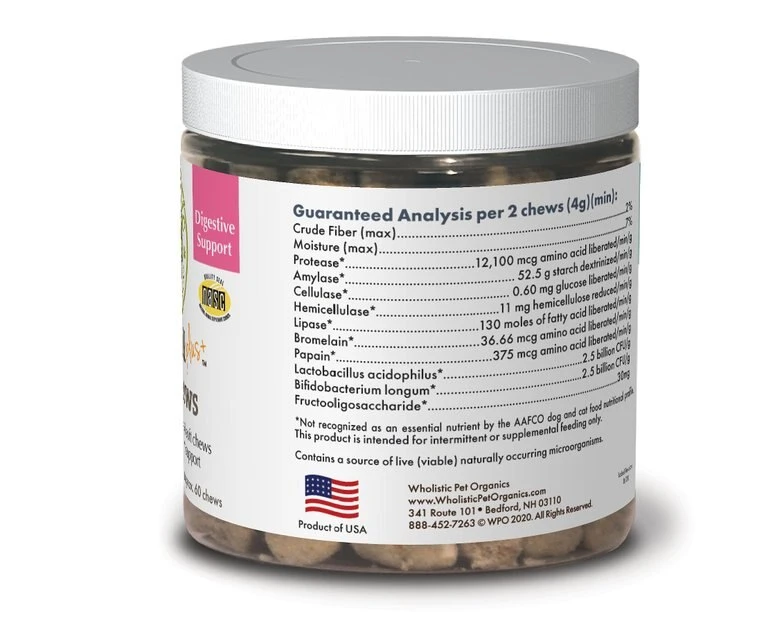 Give your pooch’s diet a boost of healthy enzymes with the Wholistic Pet Organics Digest-All Plus Soft Chews Supplement. The ready-to-eat, concentrated soft chews are specially made to support healthy digestion and overall well-being in dogs of all ages. They’re packed with probiotics—or good, gut-friendly bacteria—and plant-sourced enzymes from dried pineapple and papaya that help boost digestion. That means they help absorb more nutrients from food, and work to keep things working smoothly. Made with only raw, natural whole-food ingredients, the formula also has prebiotic fibers to help maintain regularity. Plus, it’s easy to give as daily treat!