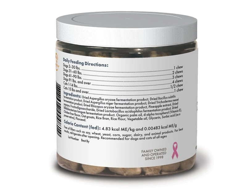 Dried Aspergillus oryzae fermentation product, Dried Bacillus subtilis fermentation product, Dried Aspergillus niger fermentation product, Dried Trichoderma reesei fermentation product, Dried Rhizopus oryzae fermentation product, Pineapple extract, Dried papaya, Fructooligosaccharide, Dried Lactobacillus acidophilus fermentation product, Dried Bifidobacterium longum fermentation product, Organic palm oil, d-alpha tocopherol (Vitamin E), Chicken liver flavor, Oat groats, Rice bran, Rice flour, Vegetable oil, Glycerin, Sorbic acid (as a preservative), Flaxseed.