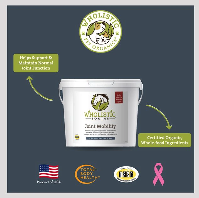 Give your equine pal a boost of joint-nourishing nutrition with the Wholistic Pet Organics Equine Complete Plus Joint Mobility. Formulated to help promote total body well-being and joint health in horses of all ages, this ready-to-mix powder formula packs essential nutrients to supplement your horse’s diet in every scoop. It’s loaded with glucosamine, chondroitin and MSM to maintain healthy cartilage and support joint health and mobility, plus Ester-C to fight antioxidants. It’s great for working horses, older horses or performance horses that need the extra joint support. Plus it’s naturally tasty so it’s easy to give, mixed in water or into your horse feed.